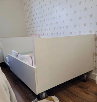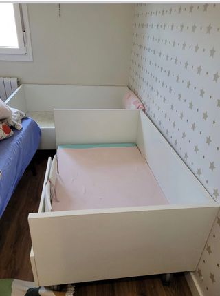 Cama infantil blanca con un diseño moderno y funcional. Ideal para habitaciones infantiles. 140*90cm - Estructura de madera lacada en blanco. - Ruedas para fácil movilidad. - Barreras de seguridad.