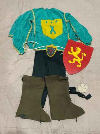 Disfraz de caballero medieval que incluye una túnica turquesa, pantalones negros, cubrebotas marrones, ( fotos detalle uno un poco rasgado en la parte inferior del uso) un cinturón o colgante con un pequeño escudo y un escudo grande de color rojo con un león amarillo. Talla 4/6 años