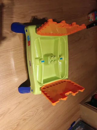 Mesa de actividades para bloques de construcciones infantiles, con patas plegables. - Color verde y naranja. - Patas azules.