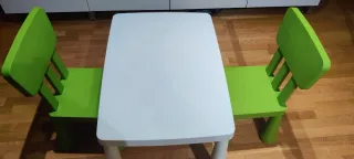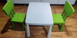 Conjunto de mesa y dos sillas infantiles de la línea Mammut de IKEA. Perfectas para que los más pequeños jueguen y coman. - Color blanco para la mesa. - Color verde para las sillas. - Material plástico resistente y fácil de limpiar.