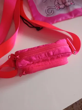 Conjunto de bolso y mochila para niña con un divertido diseño de gatito. - Bolso pequeño con cremallera. - Mochila con cordones y estampado de gatito con lazo. - Tirantes de color rosa brillante.