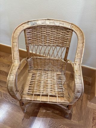 Silla infantil de mimbre con un divertido estampado de cuadros. - Estructura de mimbre. - Funda de tela con diseño de cuadros blancos y negros. Está un poco pintada como se puede ver en una de las fotos.