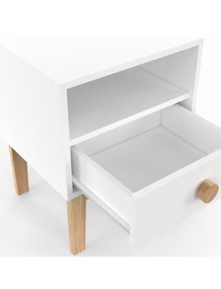 Mesita de noche infantil con un diseño moderno y funcional. Combina acabados en blanco y madera natural. - PRECIO NEGOCIABLE - Cajón con tirador redondo de madera. - Compartimento abierto superior. - Patas de madera estables. - ID Market - Modelo Jacob - Precio en Amazon con envío 45€ - Se vende porque el vendedor nos ha mandado dos. - Pequeño desperfecto en una pieza (se envían fotos si lo necesitan). Sigue siendo totalmente funcional.