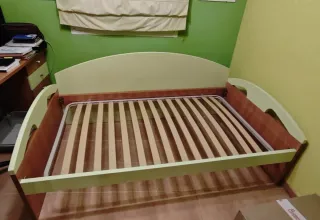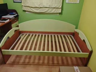 Se vende conjunto de cama nido infantil con estanterías a juego. La cama superior mide 105 cm y la inferior 90cm. Ideal para habitaciones de niños o adolescentes. - Estructura de madera y metal. - Combinación de colores marrón y verde.