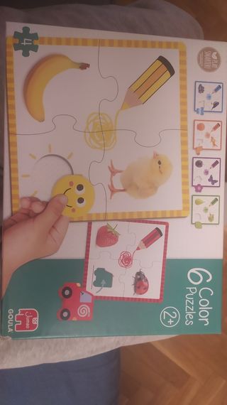 Set de 6 puzzles infantiles de la marca Goula. Cada puzzle tiene un diseño diferente con dibujos de animales y objetos. - Incluye 6 puzzles individuales. - Diseños coloridos y educativos. - Recomendado para mayores de 2 años. Mi primer libro-puzle COLORES Por separado 8 euros