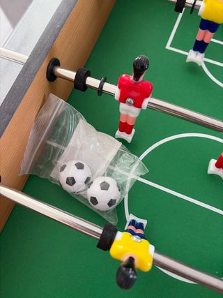 Futbolín de mesa para niños, ideal para horas de diversión. - Diseño compacto y ligero. - Incluye dos equipos de jugadores. - Barras metálicas con mangos ergonómicos.