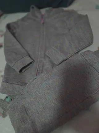 Conjunto de tres prendas de ropa infantil. - Sudadera rosa con lunares negros. - Chaqueta gris con cremallera. - Chaqueta morada de terciopelo con capucha.