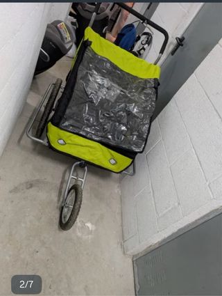 Carro infantil versátil, ideal para usar acoplado a la bicicleta o para pasear. - Estructura metálica. - Cubierta impermeable. - Rueda delantera. - Color verde y negro.