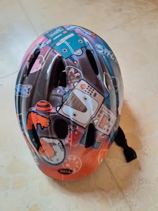 Casco de bicicleta para niños con un divertido diseño espacial. - Estampado de robots y temática espacial. - Marca Bell. - Cierre de seguridad. - Talla S. US76. Belino 262g. 52-56cm.