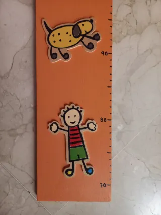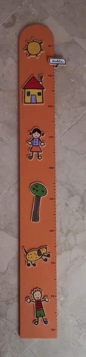 Medidor hecho en tabla de madera contrachapada de 1 cm de grosor, con escala métrica que permite medir de 70 a 160 cm y unas figuras en relieve hechas de madera contrachapada de 3 mm de grosor. Lleva una pinza para ir marcando la altura de los niños, con el nombre de Violeta, pero se puede volver a pintar fscilmente con otro nombre. Todo pintado a mano. Color naranja. Está nuevo. Muy decorativo Comprado en Taller Tres Artesania. Puedes verlo en su página web Dimensiones: 100X12X1 cm