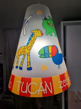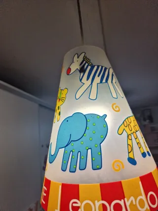 Lámparas infantil con un divertido diseño de animales a juego la de techo y la de sobremesa. - Ilustraciones de cebra, elefante y jirafa. Cada una 10 euros . Las dos 17. Recoger en Parque Alcosa.