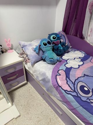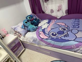 Cama nido para niña con un diseño divertido. - Estructura en color morado y blanco. - Incluye cajones de almacenamiento. - Es madera de la buena , pesa bastante y se necesitaria dos personas para transportarla - La vendo con los dos colchones. -Estaria desmontada ya que he montado otra y no tengo espacio para tenerla montada.
