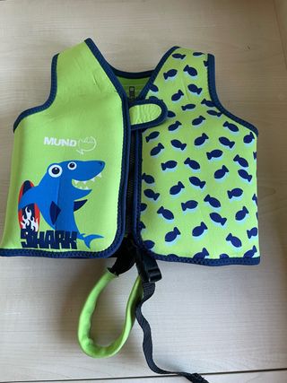 Chaleco de aprendizaje para niños con diseño de tiburón y peces. - Color verde lima con estampado de peces azules. - Dibujo de tiburón azul en la parte delantera. - Cierre de cremallera y velcro. - Asa de sujeción superior. Marca mundopetit