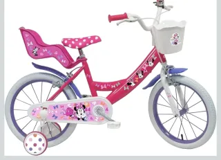 PVP: 175€ ¡Ideal para regalo! Bicicleta infantil de Minnie Mouse de 14 pulgadas con casco incluido, perfecta para niñas de 4 a 6 años (aprox. 98-110 cm). Incluye todos los accesorios originales: - Casco de seguridad a juego. - Cesta delantera y portamuñecas trasero. - Ruedines estabilizadores extraíbles. - Frenos delantero y trasero. Disponible también en 12 y 16". Más en mi perfil.