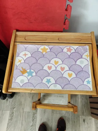 Conjunto de pupitre y silla infantil fabricados en madera. La superficie del pupitre tiene un diseño decorativo con corazones y estrellas. - Material: Madera. 64 ancho 45 fondo 58 alto La silla mide 54'5 alto (32 cm hasta el asiento). Y el Asiento es de 28x28 Necesita cambio de vinilo