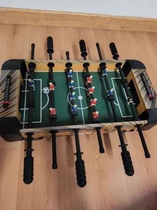 Futbolín de sobremesa para niños. - Diseño con temática de camuflaje y detalles en amarillo. - Incluye dos equipos de jugadores (rojos y azules). - Campo de juego con césped artificial y porterías.