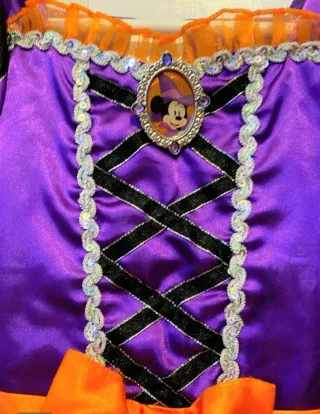 Disfraz de Minnie Mouse para Halloween, con un vibrante color morado y detalles temáticos. - Diseño inspirado en Halloween. - Adornado con estrellas plateadas. - Incluye un lazo naranja. - Detalle de Minnie Mouse en el pecho.