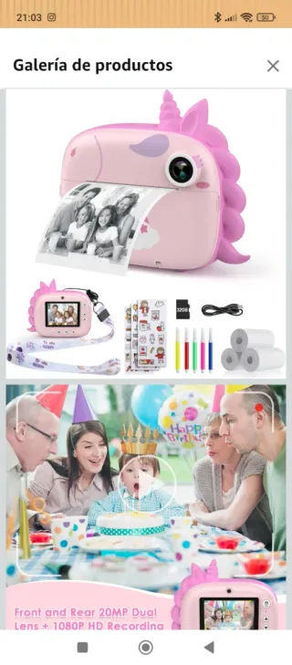 Cámara digital con diseño de unicornio, ideal para los más pequeños. Incluye accesorios para personalizar las fotos. - Cámara frontal y trasera de 20MP. - Grabación de vídeo HD 1080P. - Incluye correa, pegatinas, rotuladores y papel de impresión. - Tarjeta de memoria de 32GB.