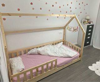 Cama infantil de madera con estructura tipo casita. Incluye colchón. - Material: Madera de pino. - Diseño: Estructura de casa con barandillas. - Colchón incluido. Usado solo 2 días.