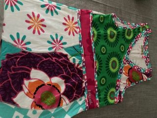 Vestido veraniego infantil de la marca Desigual con un diseño alegre y multicolor. Estampado floral y geométrico. Ideal para los días de sol. En muy buen estado. Talla 13-14 pero talla mucho menos, es más para edad entre 9-12 años en función de estatura
