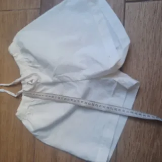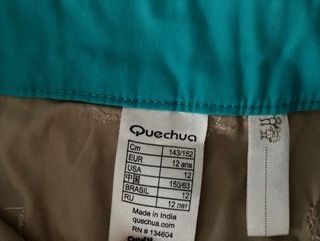 Pantalón corto infantil de la marca Quechua, ideal para actividades al aire libre. Color beige con detalles en azul celeste. Dobladillo en los bajos. Bontón de clip en cintura, ajustable con elástico interior. Como nuevo.