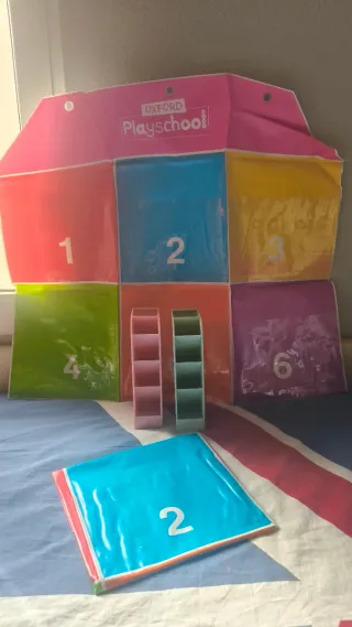 Organizador infantil de la marca Oxford Playschool con números del 1 al 6. - Diseño de casa con bolsillos. - Colores variados: rojo, azul, amarillo, verde, naranja y morado. - Ideal para clasificar y guardar objetos pequeños. Dispongo de dos . 8 € los dos Más dos portalápices 4€ los dos Si te lo llevas todo 10€ Y regalo la lamparita