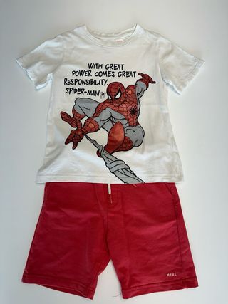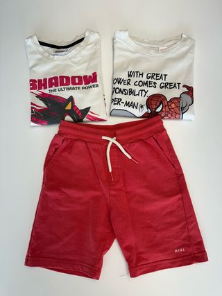 Conjunto de ropa infantil para niños de 4 a 6 años. - Camiseta blanca con estampado de Shadow The Ultimate Power. - Camiseta blanca con estampado de Spider-Man y frase With great power comes great responsibility. - Pantalón corto rojo con cordón. - Marca: MYRL