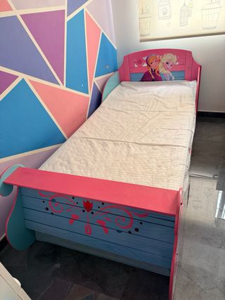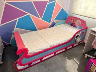 Cama infantil con diseño de trineo y temática de Frozen. Perfecta para habitaciones de niños. - Medidas: 190 cm de largo x 90 cm de ancho. - Estructura resistente con laterales decorados. - Incluye cabecero y piecero con ilustraciones de los personajes. - viene con colchon ( siempre protegido) y base - tengo videos de como montarla
