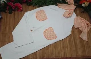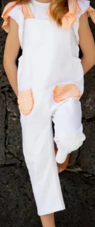 Mono infantil de color blanco, perfecto para cualquier ocasión. Cuenta con detalles encantadores que lo hacen único. - Bolsillos delanteros con estampado de cuadros naranja. - Tirantes con lazadas ajustable - Diseño cómodo y fresco..