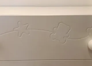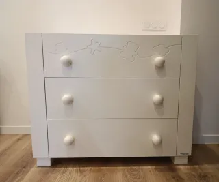 Cómoda infantil de la marca Micuna, con un diseño encantador y funcional. Para la habitación del bebé, esta en muy buen estado. Medidas 1,03 ancho × 0,85 alto × 0,57 fondo. - Tres cajones muy amplios para almacenamiento. - Tiradores redondos y decorativos. - Detalles grabados en la parte superior con motivos infantiles.