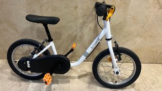 Bicicleta infantil Btwin Discover 100 en color blanco. Bici progresiva, tiene opción de añadir pedales, poco pesada. Perfecta para aprender. - Ruedas de 14 pulgadas. - Sillín ajustable en altura. - Pedales de seguridad naranjas. - Diseño ligero y resistente.