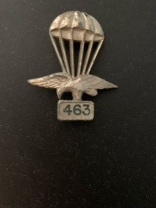 Insignia metálica de paracaidista con el número 463. - Diseño de paracaídas y águila. - Número 463 grabado.