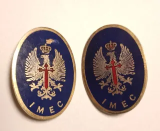 Conjunto de dos chapas o insignias de las Milicias Universitarias. - Diseño ovalado con borde dorado. - Fondo azul con águila imperial y corona. - Detalle de cruz roja en el centro del águila. - Inscripción IMEC en la parte inferior.