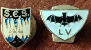 Conjunto de dos insignias antiguas relacionadas con la espeleología. - Insignia con S.E.S. y C.V.E. PUIGMAL. - Insignia con un murciélago y L.V.. - Diseño esmaltado con detalles en blanco, negro y azul. Precio por las dos no negociable
