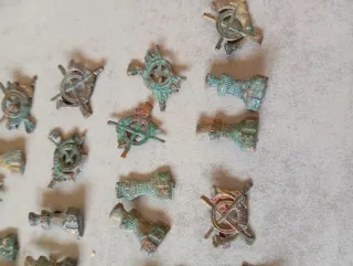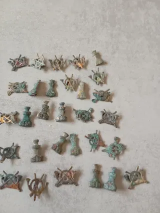 Conjunto de insignias y adornos militares, muchos de ellos con inscripciones. - Piezas metálicas de diferentes tamaños y diseños. - Algunas insignias presentan texto grabado. - Incluye elementos decorativos como espadas cruzadas y escudos.