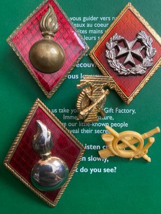 Conjunto de cuatro insignias militares con diseño romboidal de principios del siglo XX. Fondo rojo con un patrón con símbolo de arma de infantería y torre de ingenieros. Se venden en conjunto a 25 o por separado a 7 euros cada una.
