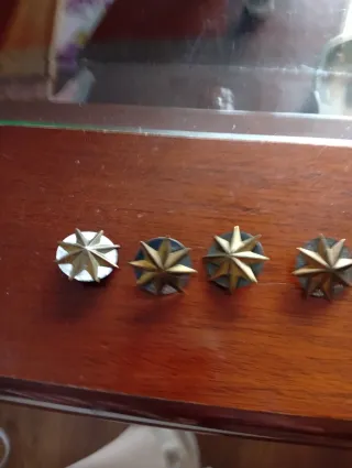 Conjunto de cuatro insignias militares doradas para rangos militares, totalmente originales. - Diseño de estrella con detalles. - Acabado en latón brillante.