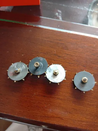 Vendo lote de 4 estrellas militares reglamentarias originales, correspondientes piezas del Ejército de Tierra (España). 🔹 Estrella de 8 puntas 🔹 Metal / latón, no reproducciones 🔹 Sistema de fijación original con rosca y tuerca 🔹 Usadas en uniforme de diario o gala 🔹 Época aproximada: años 50–70 🔹 Buen estado general, con pátina y desgaste propio del uso y la antigüedad Ideales para: ✔️ Coleccionistas de militaria ✔️ Uniformes históricos ✔️ Exposición o restauración 📦 Se vende el lote completo de 4 unidades