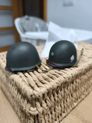 Conjunto de dos cascos militares en miniatura, ideales para coleccionistas o maquetas de estados unidos . - Color verde militar. - Correa de sujeción marrón. Con sotacasco Material plástico - Detalles de insignias. Calcomanías pegada en una ver fotos como está .