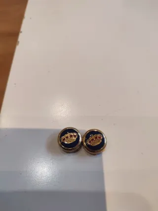 Par de insignias militares con diseño de corona dorada sobre fondo azul. - Diseño circular. - Acabado metálico dorado y esmalte azul.