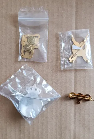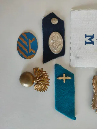 Conjunto de insignias militares y un parche. ...la insignia azul con flechas doradas está doblada y la de la llama tiene uno de los enganches roto. **** - Insignia circular azul con diseño dorado. - Insignia de tela azul con un avión dorado. - Insignia de tela azul oscuro con un botón y un emblema ovalado plateado. - Adorno dorado con forma de llama y esfera.