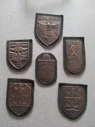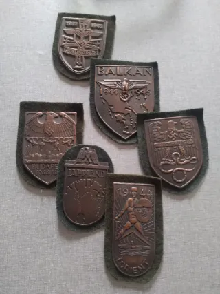 Conjunto de insignias militares alemanas de la Segunda Guerra Mundial.Produccion actual!!! - Insignia de Stalingrado 1942-1943. - Insignia de los Balcanes 1944-1945. - Insignia de Budapest 1944/4. - Insignia de Laponia. - Insignia de Marschbataillon. - Insignia de Lorient 1944.