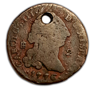Moneda de 2 Maravedís del Rey Carlos III de Borbón. Año 1776. CECA: SEGOVIA. Pequeño agujero en el centro. Aparte, vendemos Cápsulas de metacrilato con Almohadilla EVA para su conservación. Agrupa varios artículos y paga un sólo envío. Se arregla precio por cantidad. Se hacen envíos TANTO por CORREOS como por la PLATAFORMA. Pagos por transferencia bancaria, Wallapop o Bizum. Busco= Duros plata (5 pesetas). ACUÑACIONES PUERTO RICO ALFONSO XIII. Monedas locales de la 2a República Española - Menorca e IBI 1937. Medalla e insignias militares. Monedas Españolas 20, 8, 4 Reales Plata y 6, 3, 1 Maravedís. + Artículos similares perfil.