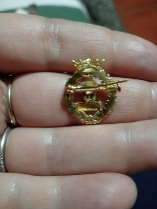 Conjunto de dos insignias militares. - Insignia con luna creciente, estrella y rombo. - Insignia con corona, luna creciente y dos rifles cruzados.