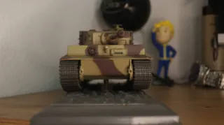 Réplica de tanque de juguete con un diseño de camuflaje en tonos tierra y marrón. El modelo presenta detalles como la torreta, el cañón y las orugas. - Diseño de camuflaje. - Número '312' en el cañón. - Insignia de águila en la torreta.
