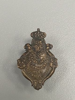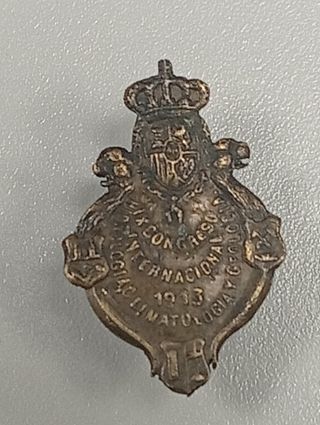 Insignia conmemorativa del Congreso Internacional de biología,geología y Climatología de 1913. Época Alfonso XIII. Muy rara. Alfonsino. Biólogos - Diseño con escudo real y corona. - Inscripción Congreso Internacional de Climatología 1913.