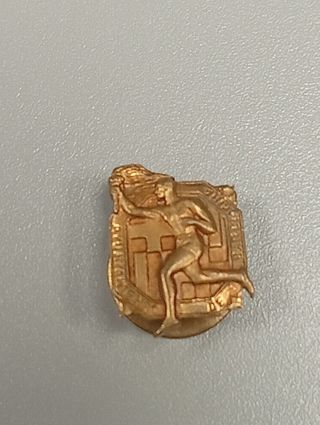 Insignia conmemorativa de la Exposición Internacional de Barcelona de 1929. Diseño con figura atlética portando una antorcha. Posiblemente inauguración estadio olímpico. Alfonso XIII. - Material: Metal dorado. - Motivo: Corredor con antorcha. - Evento: Exposición Internacional de Barcelona 1929.