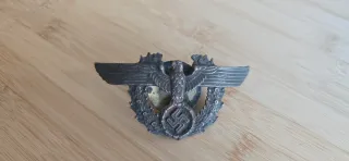 Insignia metálica con diseño de águila y esvástica, representativa del Tercer Reich. - Diseño detallado del águila con alas extendidas. - Corona de laurel rodeando la esvástica. - Acabado en tono plateado y dorado.