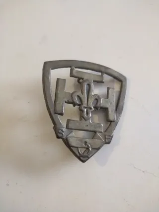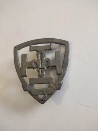 Insignia metálica con diseño de escudo. - Símbolo de los Boys Scouts. - Detalle de flor de lis y ancla. - Letras S, H, F en relieve.