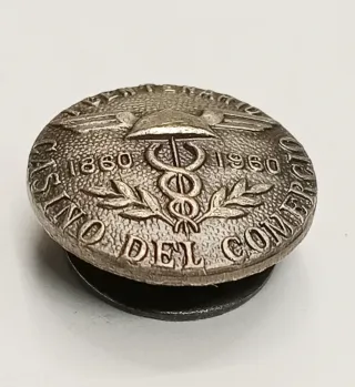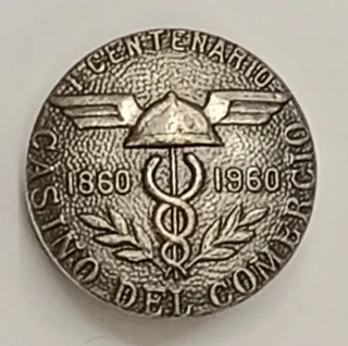 Pin Insignia de ojal conmemorativa del Centenario del Casino de Comercio de Terrassa 1860 - 1960. - Diseño circular con relieve. - Inscripción Centenario Casino Comercio Terrassa. - Años 1860 y 1960. - Símbolo central con alas y caduceo.